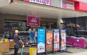 这张照片摄于2024年7月,是仰光永旺橙汁超市。(共同社 曼...